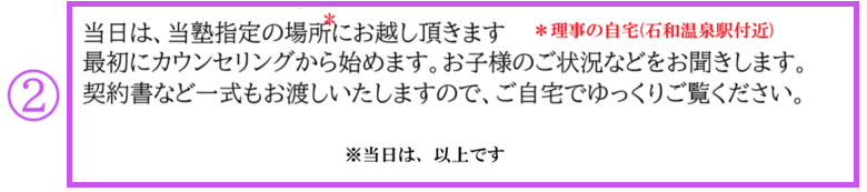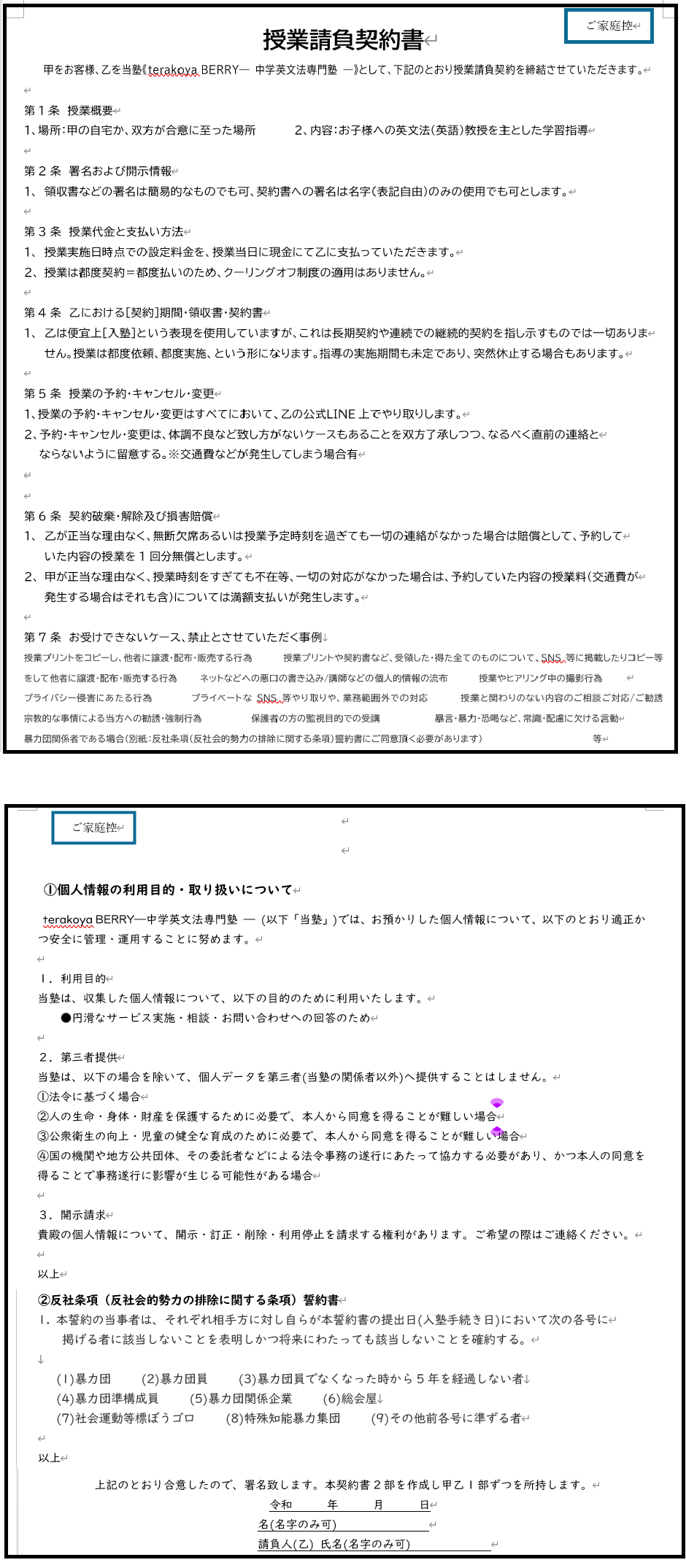 個人で経営している私塾でありますため、トラブルを出来る限り避けることを最大の目的として、以下の3点について、ご納得いただいております。