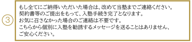 入塾手続き後は、当塾の方針等にご納得頂けたものとし以降授業を受けて頂けるようになります。